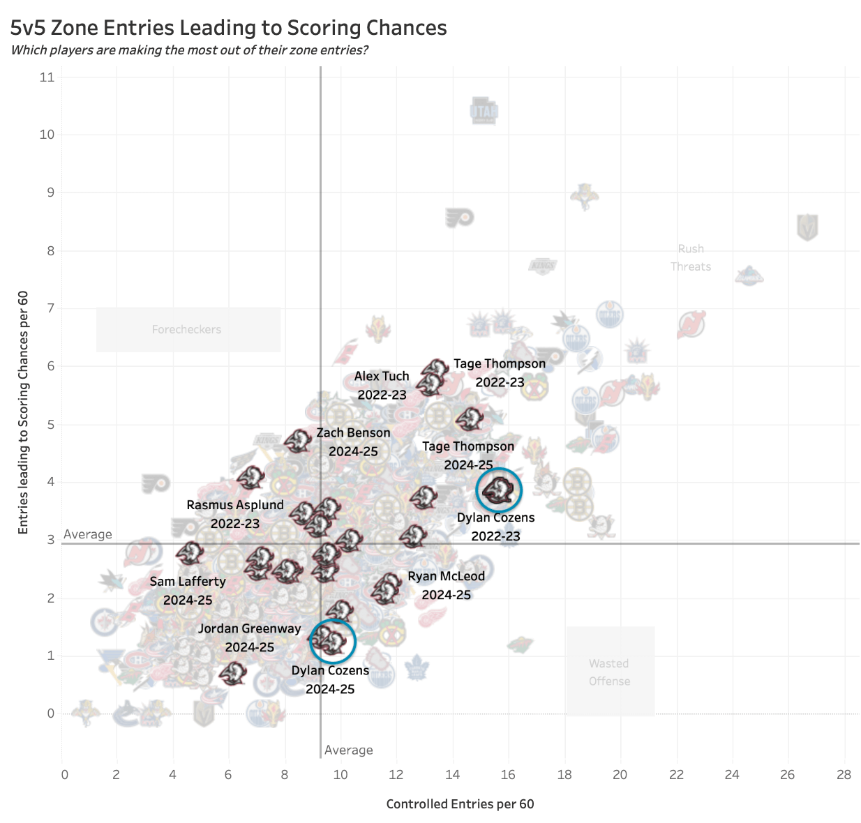 All of that has contributed to Cozens creating way fewer rush shots over the last two seasons. And unlike seasons past, the team doesn’t have another middle-six center who can excel in transition, like Casey Mittelstadt. That leaves the team without as many reliable rush threats behind Tage Thompson on the first line.