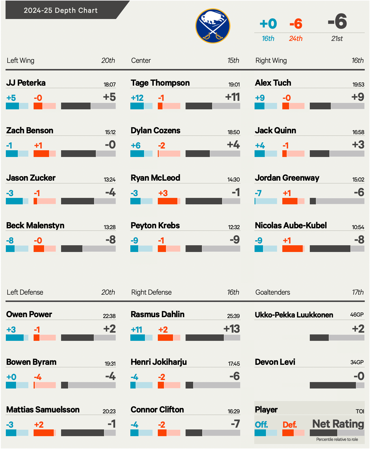 Some of the offensive weaknesses are due to the bottom-six choices made in the offseason. The fourth line could be a black hole between Beck Malenstyn, Peyton Krebs and Aube-Kubel (or Sam Lafferty) — and there isn’t a single player in the positives on the third line either. That’s true for a lot of teams, sure, but could be particularly troubling for Buffalo whose Offensive Rating from the bottom six comes out to minus-35 — 26th in the league.