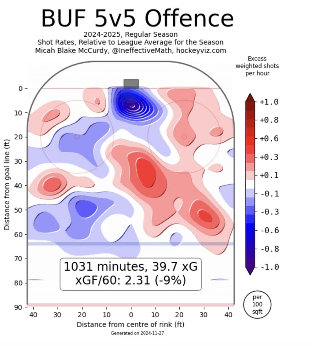 If the Sabres are going to take the next step offensively, more multi-point games from Cozens and Benson would help. And it’s how those two goals were scored that Ruff hopes leaves an imprint on his team. Both goals were the direct result of players getting to the net front and making life difficult for the goalie. That’s something Ruff still wants to see more of from his team. Their five-on-five heat map, compiled by HockeyViz, shows how glaring the net front issue is. This was an issue last season and one that hasn’t been corrected.