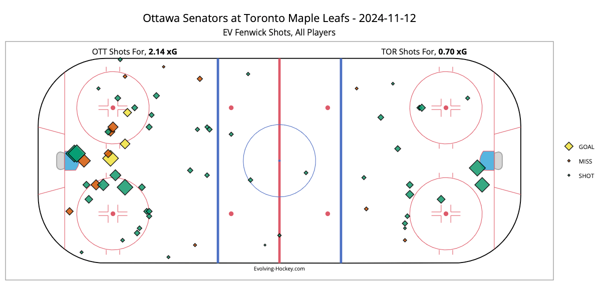 That improved defensive play was on display on Tuesday night when the Senators shut out the Maple Leafs — limiting them to just 46 unblocked attempts worth only a collective 0.7 expected goals at five-on-five.