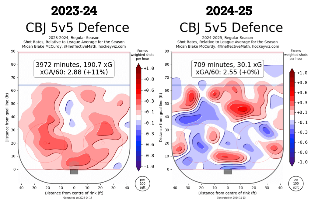There is still work to do in front of the blue paint, but the Blue Jackets are allowing a lot less from the circles at five-on-five. Those defensive improvements are trickling into their shorthanded game as well.